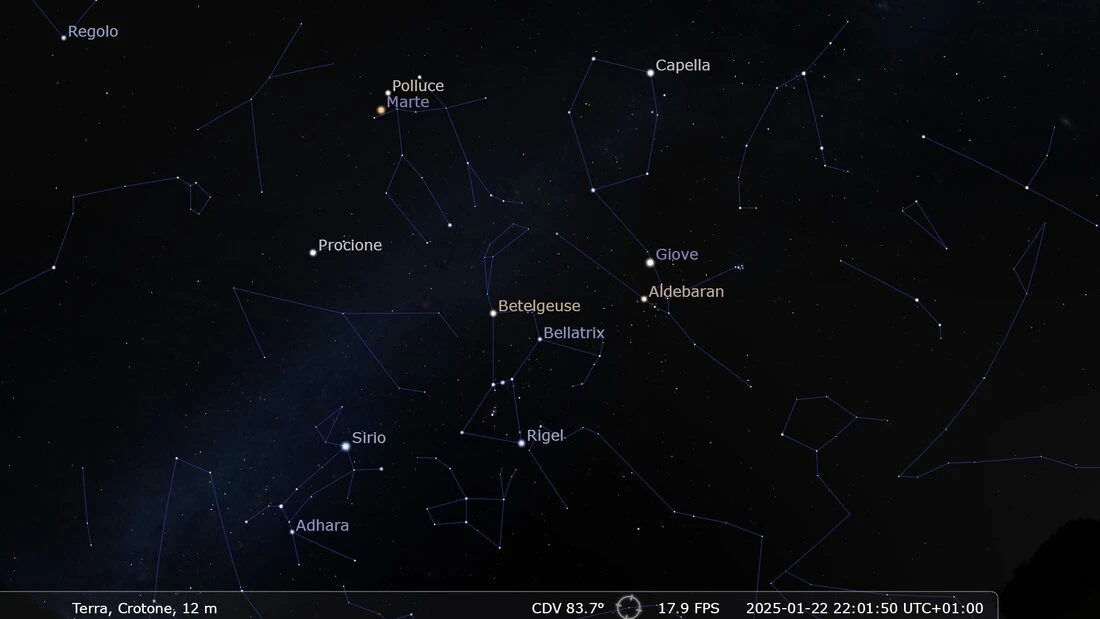 Nel nuovo anno, le luci del cosmo non si spegneranno, infatti si inizia con un cielo ricco di stelle come quello natalizio. Le costellazioni invernali risaltano e ci regalano una visione esclusiva allo Zenit del cielo stellato. La rassegna celeste, fra lo Zenit e il Sud, è dominata dall’asterismo composto dalle brillanti stelle Sirio, Procione, Polluce, Capella, Aldebaran e Rigel che compongono l'Esagono (o Circolo) Invernale.