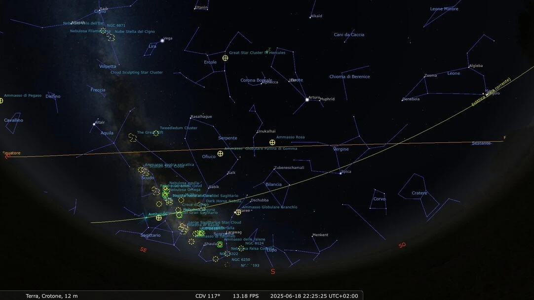 Guardando il cielo come sotto riportato dal ritaglio di Stellarium, cioè da Crotone il giorno 18 giugno dopo le 22, vedremo in alto allo zenith le costellazioni della Boote, con Arturo,  la Corona Boreale e il notevole Ercole con il grande ammasso globulare M13. A destra-ovest verso il tramonto il Leone, a sinistra-est, sopra l’equatore il Triangolo Estivo ai vertici del quale sono Deneb nel Cigno, Vega nella Lira ed Altair nell’Aquila.