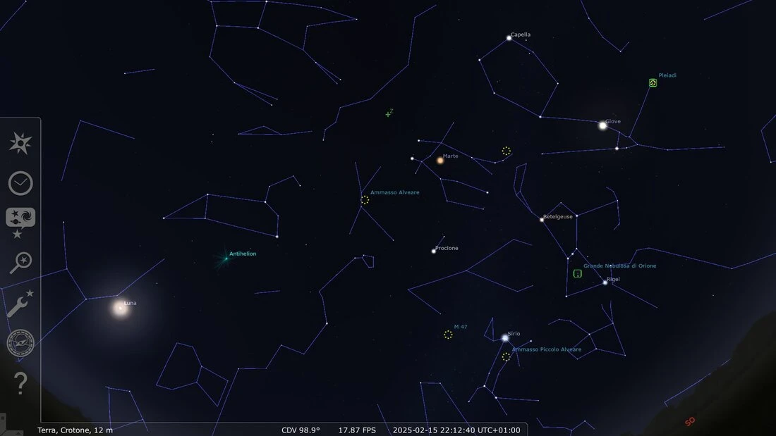 Orizzonte Sud Crotone 22 gennaio 2025 ore 22. Creato con Stellarium