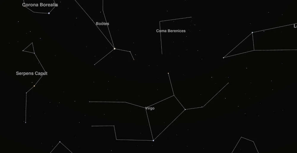 A dir la verità la volta celeste in primavera è più scura che ne resto dell’anno, rada come il sottobosco ai margini di una pineta, e con poche stelle brillanti. Tale impressione è determinata dall’effetto prospettico della nostra posizione semiperiferica in un braccio della nostra galassia. Guardando verso questa parte di cielo è come se la direzione del nostro sguardo fosse perpendicolare al piano equatoriale della nostra galassia, cioè verso l’esterno in una zona libera da nubi di polvere interstellare o da ammassi e nebulose interne alla Via Lattea.