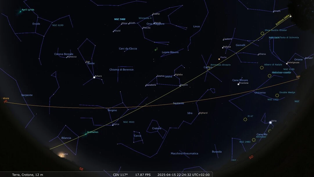 Le sere di primavera inoltrata, con il crepuscolo che si allunga e l’aria che si fa meno fredda, sembrano prestarsi alla contemplazione del cielo stellato. Il 15 di aprile, alla latitudine di Crotone, la notte vera e propria comincia dopo le 21, circa un’ora e mezza dopo il tramonto, quando termina il crepuscolo astronomico e il Sole è oltre 18° sotto l’orizzonte. Alle 22 quindi, se potessimo osservare il cielo dalla postazione privilegiata del boschetto di Savelli, o del Parco Lilio, potremmo ancora vedere a Ovest, al tramonto, le brillanti stelle dell’inverno, come Betelgeuse e Bellatrix, le spalle di Orione, Capella (la capretta) in Auriga, i Gemelli Castore e Polluce, i pianeti Giove e Marte, mentre a Est è già alta Arturo e a seguire Spica nella Vergine, già descritte nel mese di marzo.