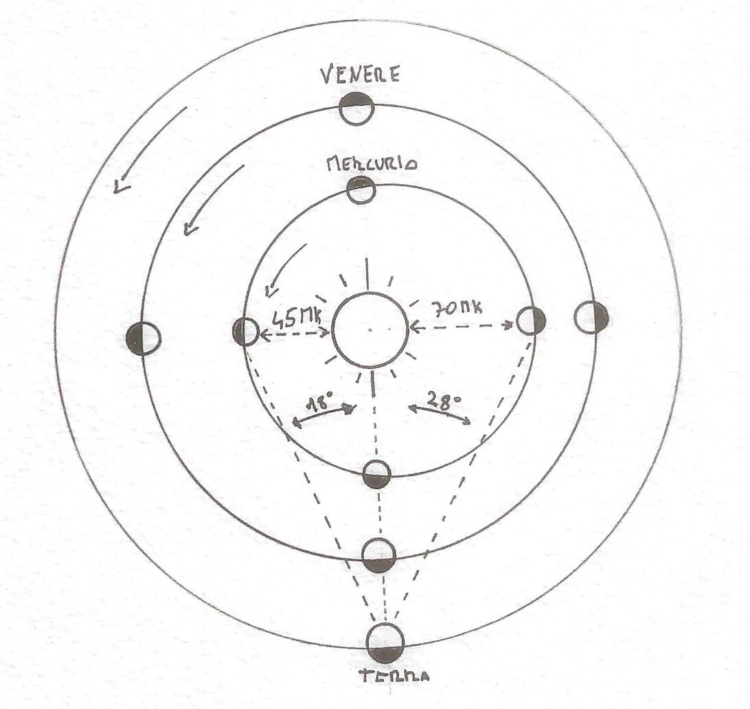 Mercurio, al telescopio, mostra fasi simili a quelle della Luna nella sua orbita intorno alla Terra. Il successivo diagramma (realizzato a mano!) mostra le orbite di Mercurio e Venere intorno al Sole, con le loro fasi. In senso antiorario dal basso: nuova, primo quarto, piena, ultimo quarto. Per Mercurio sono evidenziati la distanza minima e massima dal Sole (45 e 70 milioni di km) e gli angoli sottesi delle elongazioni (18° e 28°) visti dalla Terra.