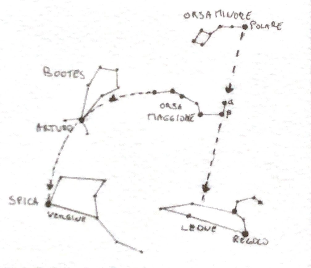 Nel disegno (sempre a mano) sopra riportato, se riconosciamo la nota costellazione del Grande Carro, o Orsa Maggiore, alta nel cielo primaverile, e dalla Polare prolunghiamo la linea retta che va alle prime due stelle del carro, incontreremo presto il Leone. Prolungando poi idealmente, con una grande linea curva, le tre stelle del timone del Grande Carro, incontreremo prima la stella Arturo nella costellazione a forma di aquilone del Boote (il Pastore) e poi Spica nella grande costellazione della Vergine (la Spigolatrice).