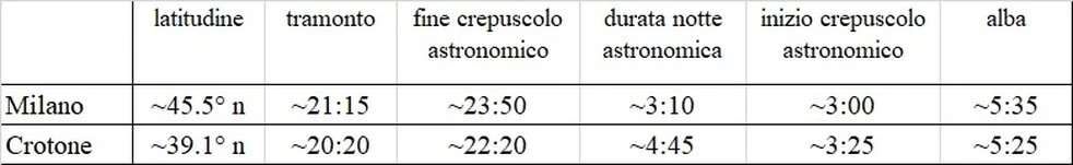 Infine, va notato che la notte astronomica si riduce nel periodo anche a seconda della latitudine. Nel periodo giugno-luglio i fortunati astrofili calabresi potranno godere di un maggiore tempo di osservazione di quelli lumbard, come si può vedere nei valori medi riportati nella tabella sottostante.